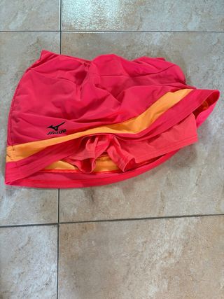 Falda deportiva de la marca Mizuno, ideal para jugar tenis. Es de color rojo y naranja. - Diseño deportivo y moderno. - Tejido ligero y cómodo. - Perfecta para cualquier entrenamiento.