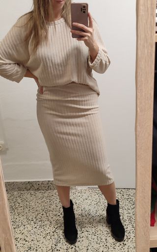 Precioso y comodísimo conjunto nuevo a estrenar de Shein. Ideal para tus looks diarios: irás mona, cómoda y con estilazo al mismo tiempo 😍👗 Muy versátil, combina genial con botas, botines o tenis. ¡Perfecto para cualquier plan! ✨ La tela es suave, cómoda y no transparenta ✔️ La falda tiene cintura elástica, se adapta muy bien al cuerpo 💕 La camiseta es más cortita por delante, ideal para meterla dentro sin que abulte. 💌 Envío disponible 🚫 No hago cambios 📍Si estás en Málaga capital, puedes venir a verlo sin compromiso 🛍️ Échale un vistazo a mi perfil, tengo más cositas interesantes!!