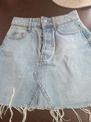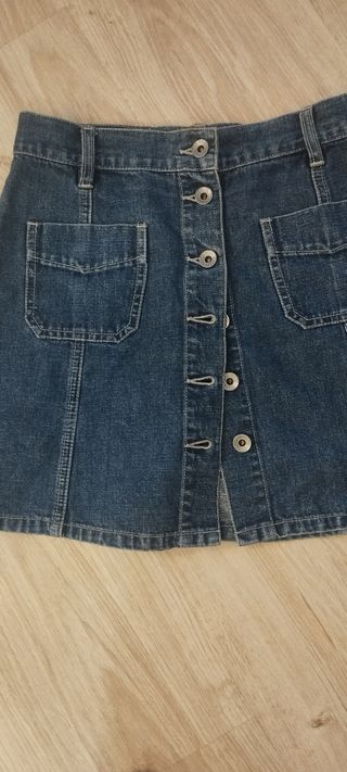 Falda vaquera de estilo moderno con cierre de botones. - Diseño con múltiples botones frontales. - Bolsillos laterales. - Costuras visibles. -Altura de las rodillas tal y como se muestra en la imagen (mido 1,53)