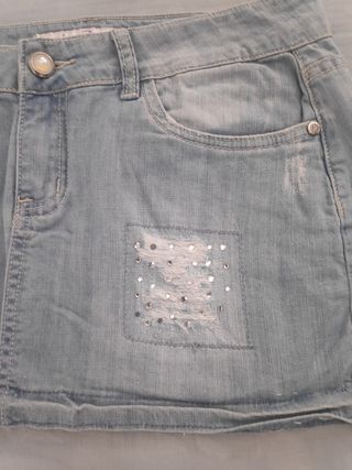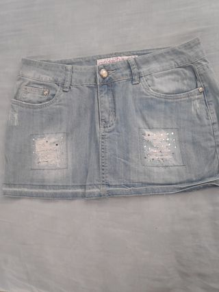Preciosa minifalda vaquera de la marca Miss Azzurra. Es de color azul claro y tiene un diseño desgastado con detalles de pedrería. - Tiene dos bolsillos delanteros funcionales. - La tela es de mezclilla ligera. - Perfecta para primavera/verano. Minifalda Vaquera Miss Azzurra para Mujer. Cintura Media con cierre de Cremallera no Visible y Botón. Tres Bolsillos Frontales Superiores. Llevo Dos Bolsillos Traseros Superiores. Diseño con detalles de Rotos brillantes en relieve y cadena. Muy Suave, Cómoda, Ligera, Fresca. -Marca: Miss Azzurra. -Composicion: 98% Algodón, 2% Elastano. -Color: Azul Claro. -Talla: XXS. -Estado: Muy Bueno