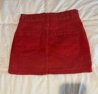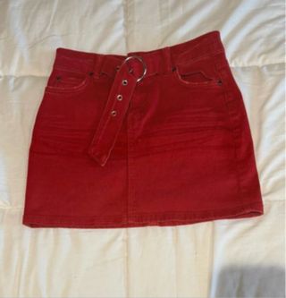 Falda vaquera corta de color rojo, con un diseño moderno y juvenil. - Cinturón con hebilla metálica incluido. - Bolsillos delanteros. - Cierre de cremallera y botón.