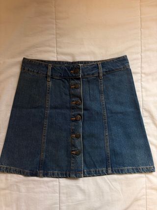 Falda vaquera de corte A. - Cierre de botones. - Bolsillos delanteros y traseros. - Costuras decorativas. - valida para una talla S o M ya que viene grande