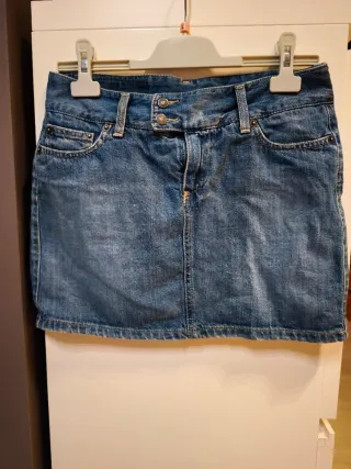 Mini falda de estilo vaquero. - Elástica. - Diseño clásico de cinco bolsillos. - Cierre de cremallera y botón. - Costuras visibles. - Nunca usada pero sin etiqueta.