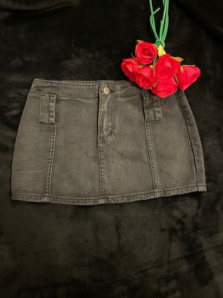 Falda corta de estilo vaquero en tono negro. Un básico versátil para cualquier ocasión. - Diseño de tiro alto. - Detalle de bolsillos delanteros. - Cierre de botón y cremallera.