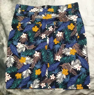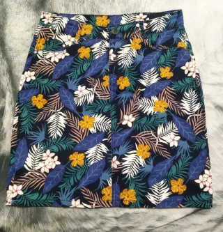 Falda vaquera con un llamativo estampado tropical de hojas y flores. - Diseño de tiro alto. - Cierre de botón y cremallera. - Bolsillos delanteros y traseros. - Elástica y muy cómoda