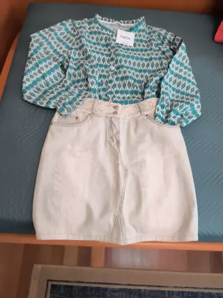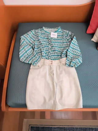 Conjunto de dos piezas camisa de manga larga con dibujos con la etiqueta de la marca NANA y falda vaquera clara - Camisa con estampado geométrico en tonos verdes y blancos. - Falda vaquera clara. - Cintura de encaje