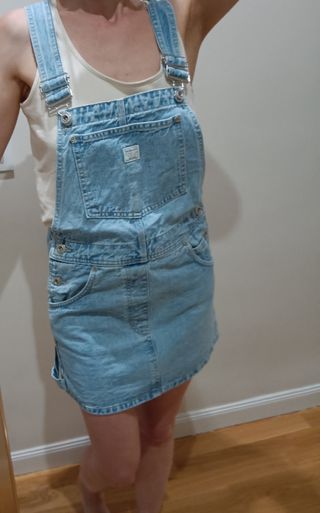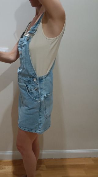 Peto vaquero en falda. Ideal para cualquier ocasión. - Diseño de falda corta. - Tirantes ajustables. - Detalle deshilachado en el bajo.