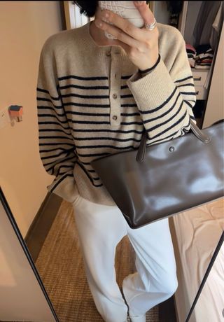 Jersey de punto con diseño de rayas horizontales. - Cuello redondo con abertura de botones. - Manga larga. - Tejido suave y cómodo. Súper suave con mucho estilo. Queda ideal con vaqueros, faldas o debajo de una gabardina.🧥