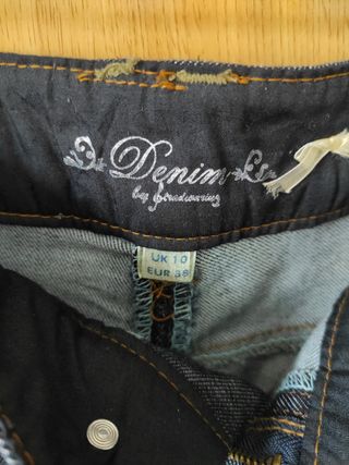 Falda vaquera de largo asimétrico, borde con volante deshilachado. Pone talla 30, yo diría que equivale a una S-M, según la pongas en cintura o cadera. Lleva un 5 % de elastano por lo que resulta muy cómoda de llevar.Está en muy buen estado.