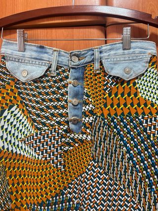 Falda larga con un diseño patchwork vibrante y detalles vaqueros. - Cintura alta con botones. - Estampado geométrico multicolor. - Bajo con volante.