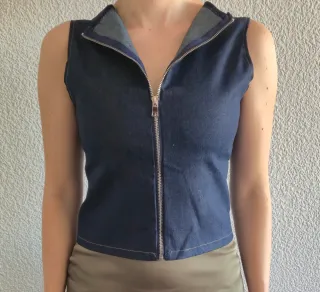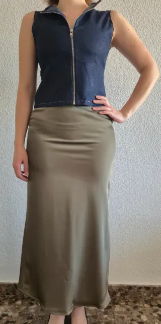 Vendo este outfit completo porque combinan a la perfección. Ambas prendas están a estrenar. Top: Chaleco vaquero azul oscuro con cremallera frontal y un diseño espectacular de aberturas (cut-out) en la espalda. Falda: Falda midi de corte recto/evasé en color verde oliva/caqui con acabado satinado brillante. Estado: Nuevo, nunca usado. Talla: S Medidas: Top (Pecho/Sisa): ~95 cm de contorno. Falda (Largo): ~92 cm desde la cintura hasta el bajo. Falda (Cadera): ~105 cm de contorno. Envío ordinario (Bizum) o Wallapop.