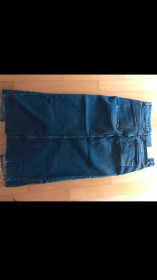 Falda vaquera midi Talla M 38, Marca Kingsbono, con cinco bolsillos. Cierre de cremallera y botón. Costuras reforzadas. Material: 98% algodón 2% elastán. Medidas: 59 cm largo x 36 cm ancho cintura (72 cm suma contorno entero) x 46 cm ancho resto de la falda. Las manchas que ven como de desgaste es que son así de la falda, no es que se hayan desgastado. Si eres de Zaragoza se puede recoger en San José, Aragonia o Parque Grande.