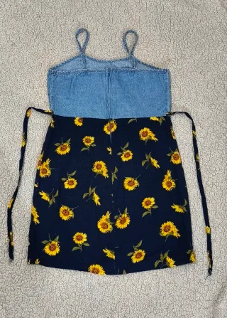Vestido corto con parte superior vaquera y falda estampada con girasoles. - Tirantes finos. - Detalle de girasol bordado en el pecho. - Estampado de girasoles sobre fondo azul marino. - Lazos laterales para ajustar. - Talla XS - S.