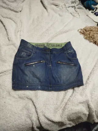 Minifalda vaquera de la marca Benetton. - Diseño clásico. - Detalle de bolsillos delanteros. - Cierre de cremallera y botón. Esta arrugado por estar guardado. Se lava en lavadora.