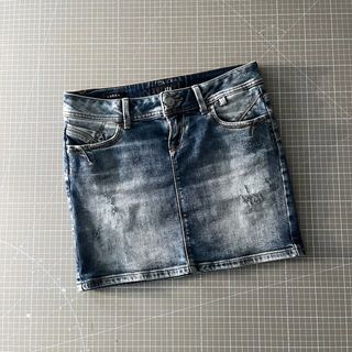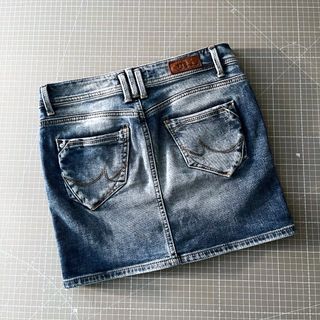 Falda de estilo vaquero, con un diseño clásico y versátil. - Detalle de pedrería en el bolsillo. - Costuras en contraste. - Cierre de botón y cremallera. En perfecto estado