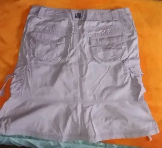 Falda de estilo cargo en color tipo lila. Presenta un diseño moderno con múltiples bolsillos. - Bolsillos frontales con solapa. - Bolsillos laterales tipo cargo. - Cintura con trabillas para cinturón. - Bajo ajustable con cordón.