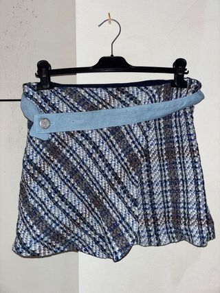 Falda de tejido tweed con un diseño de cuadros en tonos azules y marrones. Presenta un detalle de cinturón de tela vaquera clara en la cintura. - Tejido tweed - Diseño de cuadros - Detalle de cinturón vaquero