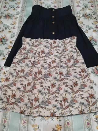 Conjunto de dos faldas de la marca Zara. Una es de color azul marino y la otra presenta un estampado floral y de paisley en tonos tierra. Ambas con bolsillos y gomas en la cintura. Corte evasé. - Falda azul marino abrocha con botones dorados cintura alta. Largo 53cm. Cintura sin estirar 33cm. - Falda estampada con cintura elástica y cremallera delantera. Largo 46cm. Cintura 36cm. Están como nuevas