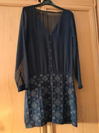 Elegante vestido azul marino de Zara, ideal para ocasiones especiales. Presenta un diseño con botones en la parte delantera y detalles bordados en la falda. - Mangas largas de tejido semitransparente. - Cintura elástica. - Adornos de pedrería y bordados geométricos en la parte inferior. - cremallera en la falda. - Forro en la falda.