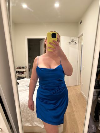 Vestido de satén con un vibrante color azul. - Diseño con tirantes finos. - Drapeado en la falda. - Largo mini.