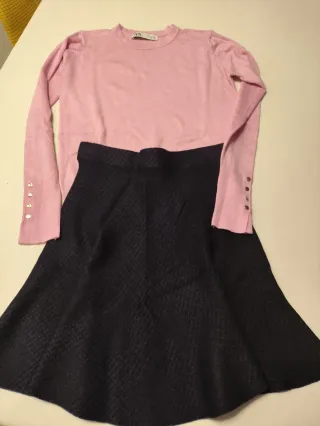 Conjunto de falda y jersey. - Jersey de manga larga en color rosa. Zara - Falda con vuelo "Trucco" azul oscuro nueva con etiqueta