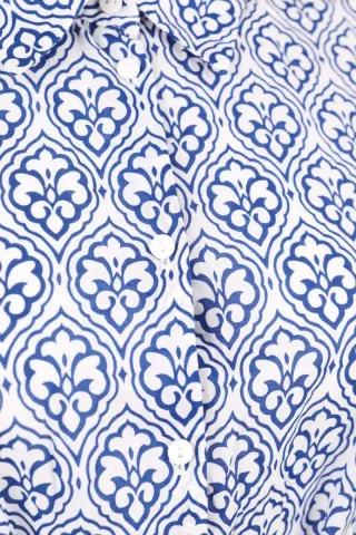 Elegante falda corta con un llamativo estampado de hojas en tonos azul marino y blanco. Detalle de un pequeño aplique floral en la parte inferior. - Diseño de hojas. - Corte recto. - Tejido texturizado.