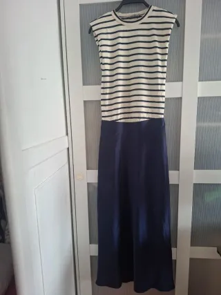 Vestido midi combinado con parte de arriba acanalada de rayas azul marino y blanco y cuello halter suave elástico en la cintura , la falda esa amplia con bolsillos y aberturas laterales en azul marino. Precioso y cómodo, con etiqueta, vendo otro igual pero en day también de la talla XS. Es viral, agotado en todas las tiendas de Zara y en la web. Más vestidos calzado joyería y otros artículos NUEVOS CON ETIQUETA en mi armario échale un vistazo hago descuento por lote 🫶🏻