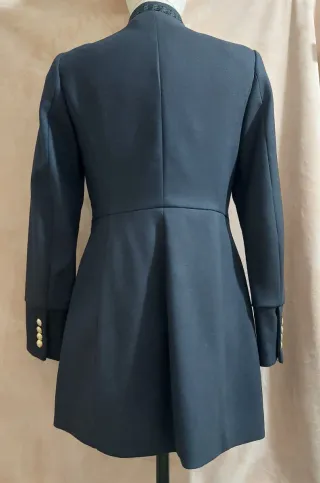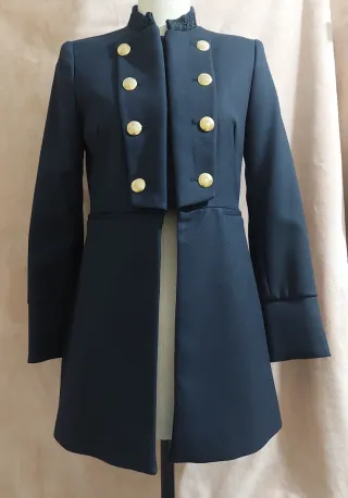 Elegante levita de Zara con un diseño clásico y detalles distintivos. - Cierre de doble botonadura con botones dorados. - Cuello alto con detalle de encaje. - Corte entallado y falda acampanada.