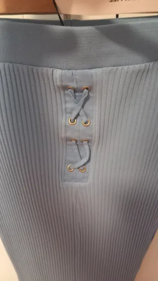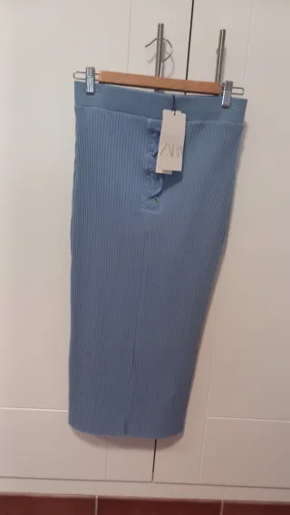 Falda midi de punto de la marca Zara. Diseño acanalado con detalle de cordones en la parte delantera. - Largo midi. - Tejido de punto acanalado. - Cierre de cordones en la cintura. Envío por wallapop, oportunidad a mitad de precio