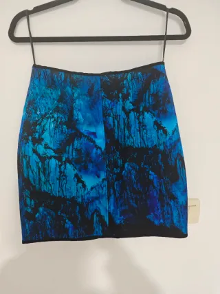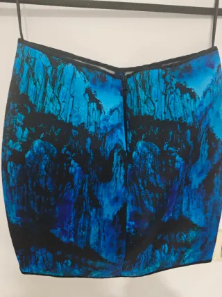 Falda con un llamativo estampado que combina tonos azules y negros. Corte recto y cremallera en la parte trasera.