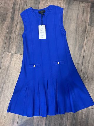 Vestido de punto de la marca ZARA en color azul. Diseño sin mangas con detalles acanalados y falda plisada. - Dos bolsillos delanteros con botones dorados. - Cuello redondo. - Largo hasta la rodilla.