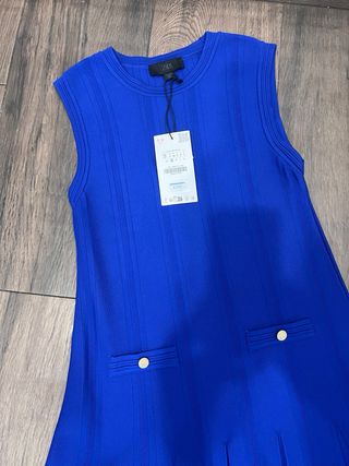 Vestido de punto de Zara en color azul. Diseño sin mangas con detalles acanalados y dos bolsillos delanteros con botones dorados. - Corte recto con vuelo en la falda. - Cuello redondo. - Cierre de cremallera invisible en la espalda.
