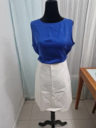 Vestido de verano con un diseño de dos piezas. - Parte superior de color azul vibrante. - Falda de color blanco. - Diseño sin mangas.