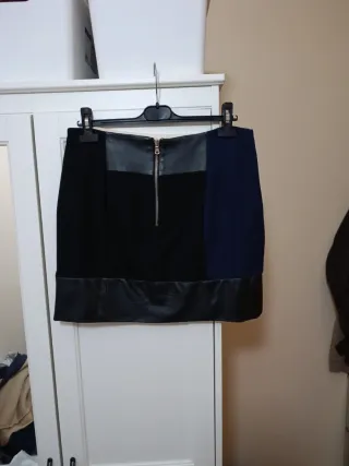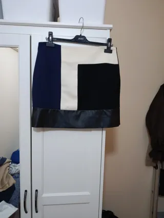 Falda de Zara con un diseño moderno y elegante. - Combinación de bloques de color: azul marino, beige y negro. - Detalle de polipiel en el bajo.