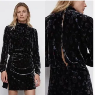 Divino minivestido de terciopelo en estampado paisley con fondo negro de Zara. Con detalles en azul marino, granate y ocre. Cuello perkins y apertura en la espalda, desde el cuello hasta la cintura. La falda es más ajustada, y tiene un pequeño corte, mientras que el cuerpo es abullonado. Mucho más bonito puesto 🥰 Precio de compra: 50€.