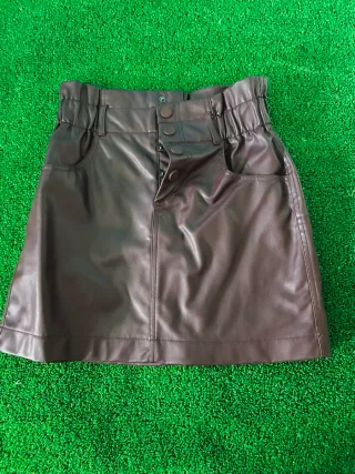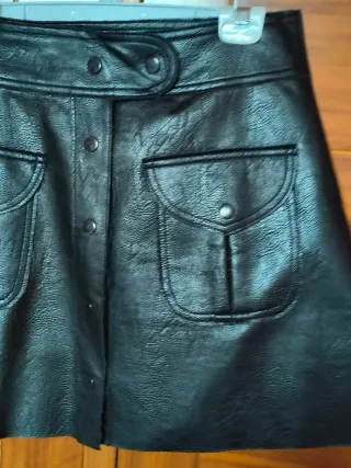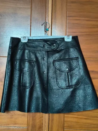 Falda de piel sintética con un diseño moderno y versátil. - Dos bolsillos delanteros con solapa. - Cierre de botón y cremallera. - Cintura con trabillas para cinturón. En perfecto estado