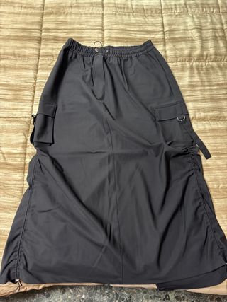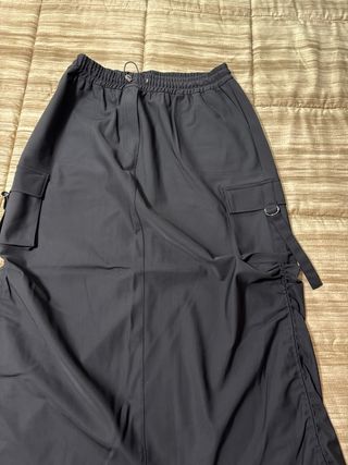 Falda larga de estilo cargo con un diseño moderno y funcional. - Cintura elástica con cordón ajustable. - Bolsillos laterales tipo cargo. - Detalle de cordones fruncidos en los laterales. - Cremallera y botón en la parte delantera.