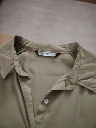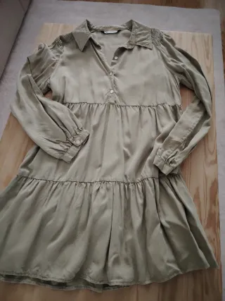Vestido de Zara en color verde militar, ideal para días cálidos. - Diseño con cuello camisero. - Manga larga abullonada con puño. - Cuerpo fruncido en los hombros. - Falda con varios volantes. - Cierre de botones en la parte superior.