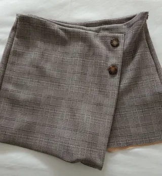 Falda pantalón corta con estampado de cuadros. Queda muy bonita con medias tupidas marrón chocolate para un look juvenil, a la vez que elegante - Diseño cruzado. - Cierre con botones. - Bajos sin costuras