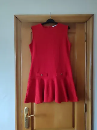 Vestido de Zara con un diseño elegante y moderno. - Tejido elástico para mayor comodidad. - Detalle de botones dorados en la parte frontal. - Escote cuadrado. - Corte acampanado en la falda.