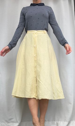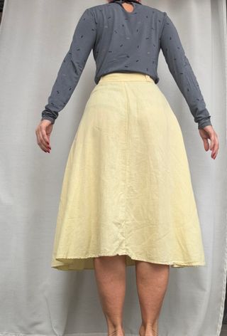 Falda midi de corte en A. Color amarillo claro. Botones funcionales en la parte delantera. Cintura con opción de llevar cinturón. Composición: 53% lino y 47% algodón. Marca: Zara. Talla: M