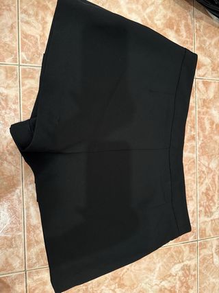 Falda corta de Zara con acabado satinado. - Bolsillos delanteros. - Cierre de botón y cremallera. - Detalle de botón joya.