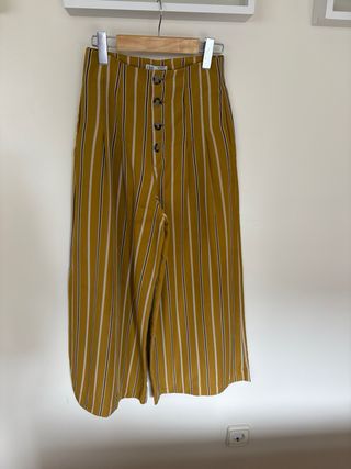 Pantalón tipo falda de Zara con un diseño de rayas verticales. - Estampado de rayas multicolor en tonos amarillos. - Cierre de botones en la parte delantera. - Corte ancho y fluido.