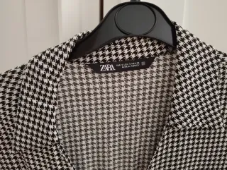 Elegante vestido estilo blazer de Zara. Presenta un diseño cruzado con doble botonadura y un detalle de falda plisada. - Mangas tres cuartos. - Cuello solapa. - Cierre de botones.