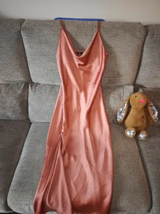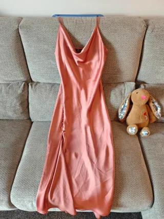 Vestido largo de tirantes finos con un favorecedor escote drapeado. El tejido satinado le da un toque elegante y sofisticado. - Detalle de botones en el lateral. - Abertura lateral en la falda.