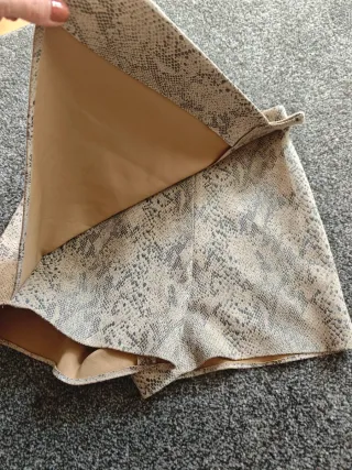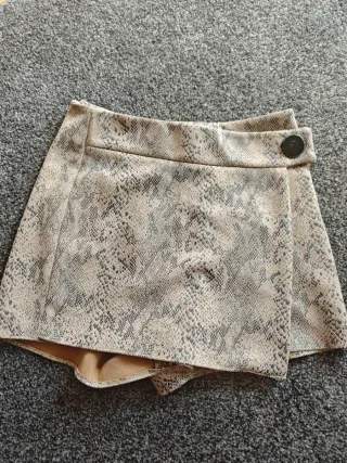 Falda pantalón de Zara con un llamativo estampado de serpiente. - Diseño cruzado. - Detalle de botón. - Color beige y negro.
