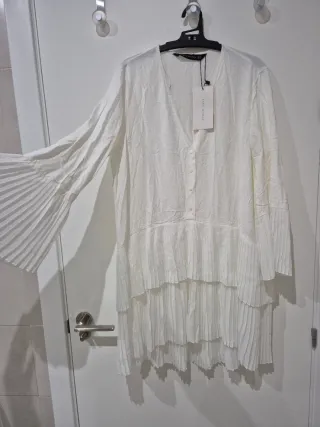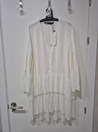 Vestido blanco de Zara, ideal para días frescos. Presenta un diseño con volantes y detalles plisados. - Escote en V. - Cierre de botones en la parte delantera. - Mangas largas. - Diseño en capas con volantes. - Acabado plisado en mangas y falda.