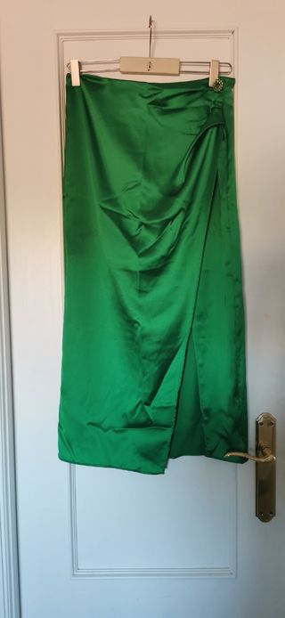 Elegante falda larga de satén en un vibrante color verde esmeralda. Su diseño fluido y brillante la hace perfecta para ocasiones especiales. - Tejido satinado con caída. - Diseño cruzado con abertura. - Detalle de abalorio en la cintura. Estilosa falda satinada en color verde esmeralda de Zara. Es de raso, con una caída muy elegante y un botón joya en la parte superior. Tiene una raja lateral muy sutil. Me la he puesto tan solo una vez para una boda. Ese día se. Me enganchaba con el bolso que llevaba y por ello la tela tiene algunos desperfectos. La última foto señala una tara de la tela. Me costó 30 €.