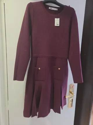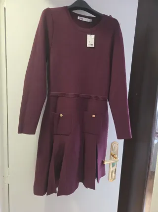 Vestido de punto de manga larga con detalles de botones dorados en los hombros y bolsillos delanteros. - Diseño con cintura marcada. - Falda con pliegues. - Tejido de punto.
