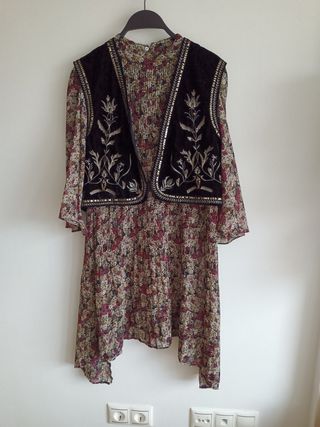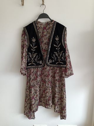 Precioso vestido estilo romántico de Zara con estampado floral multicolor. La prenda NO incluye chaleco. - Vestido de casa con falda plisada. - Cierre con botones en la parte trasera.